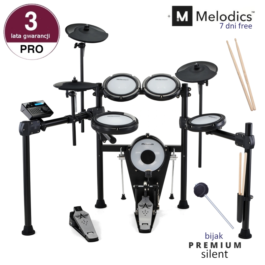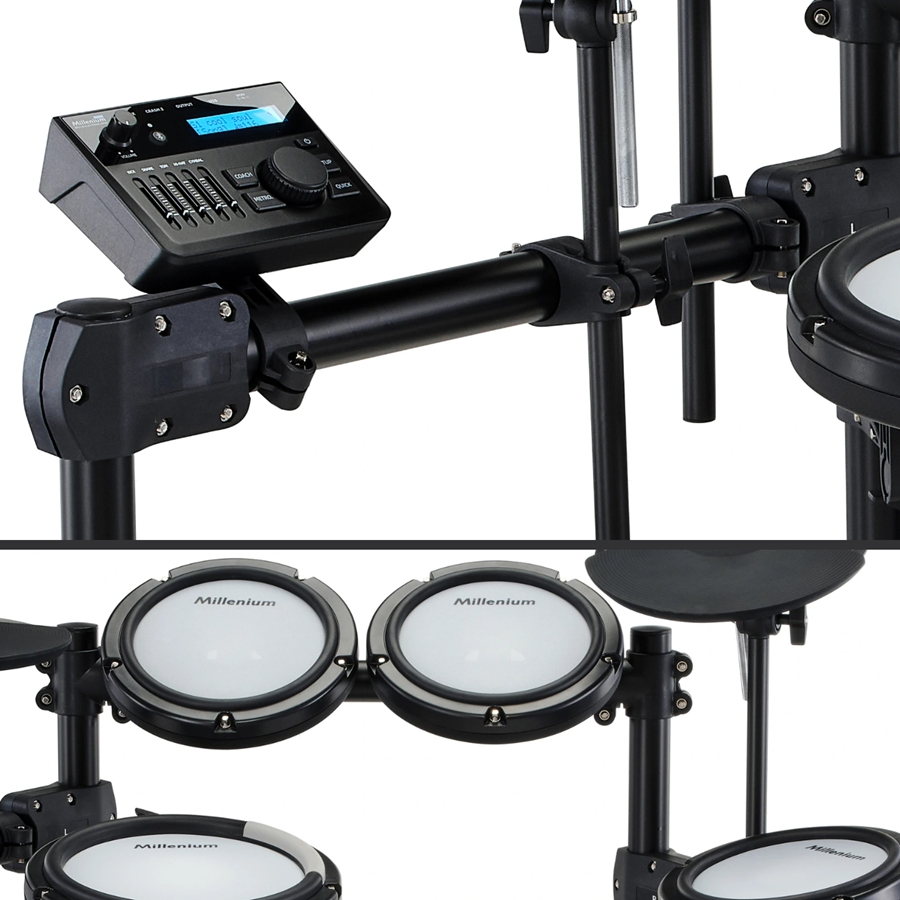 Zestaw perkusyjny Millenium MPS-350 to dostępna cenowo opcja e-perkusji, naśladująca w pełni profesjonalne modele Roland/Yamaha. Jeśli chcesz rozpocząć lub kontynuować grę na rozsądnym cenowo instrumencie koniecznie poznaj ten zestaw lepiej! E-Drum łączy nowoczesny design z realistyczną grywalnością i elastycznymi możliwościami podłączania w jednym kompaktowym urządzeniu. Niezależnie od tego, czy ćwiczysz w domu, grasz na próbach, czy występujesz na żywo, ten zestaw zapewnia wszystko, czego potrzebujesz, aby cieszyć się doskonałymi wrażeniami z gry na perkusji. MPS-350 zawiera 8-calowy bęben basowy kompatybilny z podwójnymi pedałami, 8-calowy werbel dwustrefowy z oddzielną strefą crossstick obręczy oraz trzy 7-calowe tomy. Posiada również pady hi-hat, crash i ride, każdy z podwójną strefą i funkcją wyciszania.
