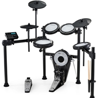 Zestaw perkusyjny Millenium MPS-350 to dostępna cenowo opcja e-perkusji, naśladująca w pełni profesjonalne modele Roland/Yamaha. Jeśli chcesz rozpocząć lub kontynuować grę na rozsądnym cenowo instrumencie koniecznie poznaj ten zestaw lepiej! E-Drum łączy nowoczesny design z realistyczną grywalnością i elastycznymi możliwościami podłączania w jednym kompaktowym urządzeniu. Niezależnie od tego, czy ćwiczysz w domu, grasz na próbach, czy występujesz na żywo, ten zestaw zapewnia wszystko, czego potrzebujesz, aby cieszyć się doskonałymi wrażeniami z gry na perkusji. MPS-350 zawiera 8-calowy bęben basowy kompatybilny z podwójnymi pedałami, 8-calowy werbel dwustrefowy z oddzielną strefą crossstick obręczy oraz trzy 7-calowe tomy. Posiada również pady hi-hat, crash i ride, każdy z podwójną strefą i funkcją wyciszania.