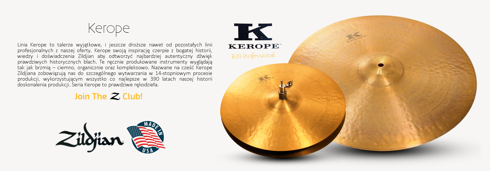 Linia Kerope to talerze wyjątkowe. Swoją inspirację czerpie z bogatej historii, wiedzy i doświadczenia Zildjian aby odtworzyć najbardziej autentyczny dźwięk prawdziwych historycznych blach. Te ręcznie produkowane instrumenty wyglądają tak jak brzmią – ciemno, organicznie oraz kompleksowo. Nazwane na cześć Kerope Zildjiana zobowiązują nas do szczególnego wytwarzania w 14-stopniowym procesie produkcji, wykorzystującym wszystko co najlepsze w 390 latach naszej historii doskonalenia produkcji. Seria Kerope to prawdziwe rękodzieła.